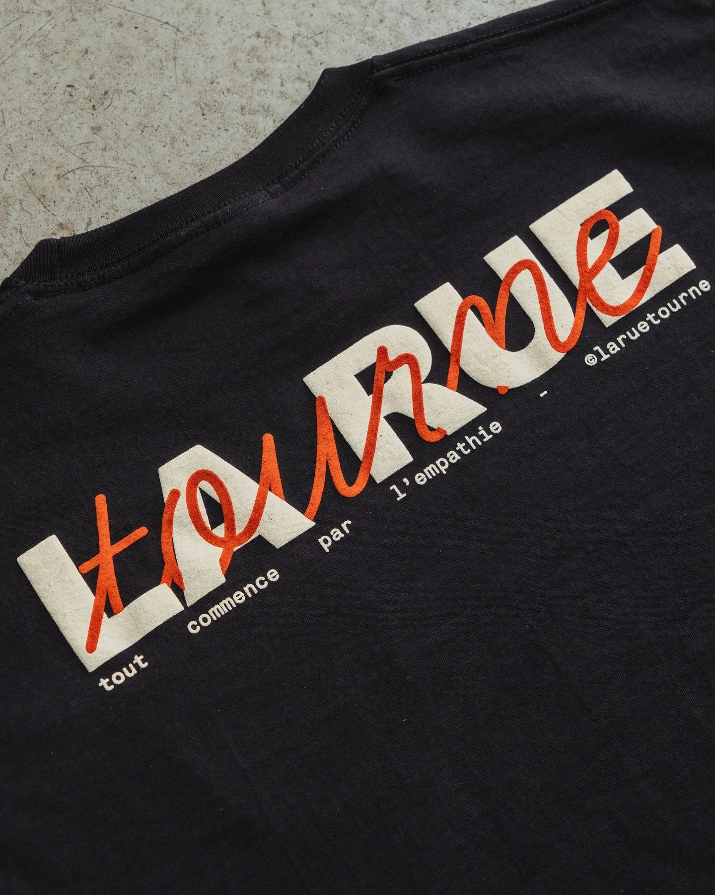 @laruetourne sérigraphie double couleur orange et beige pour annoncer leur nouvelle identité visuels !